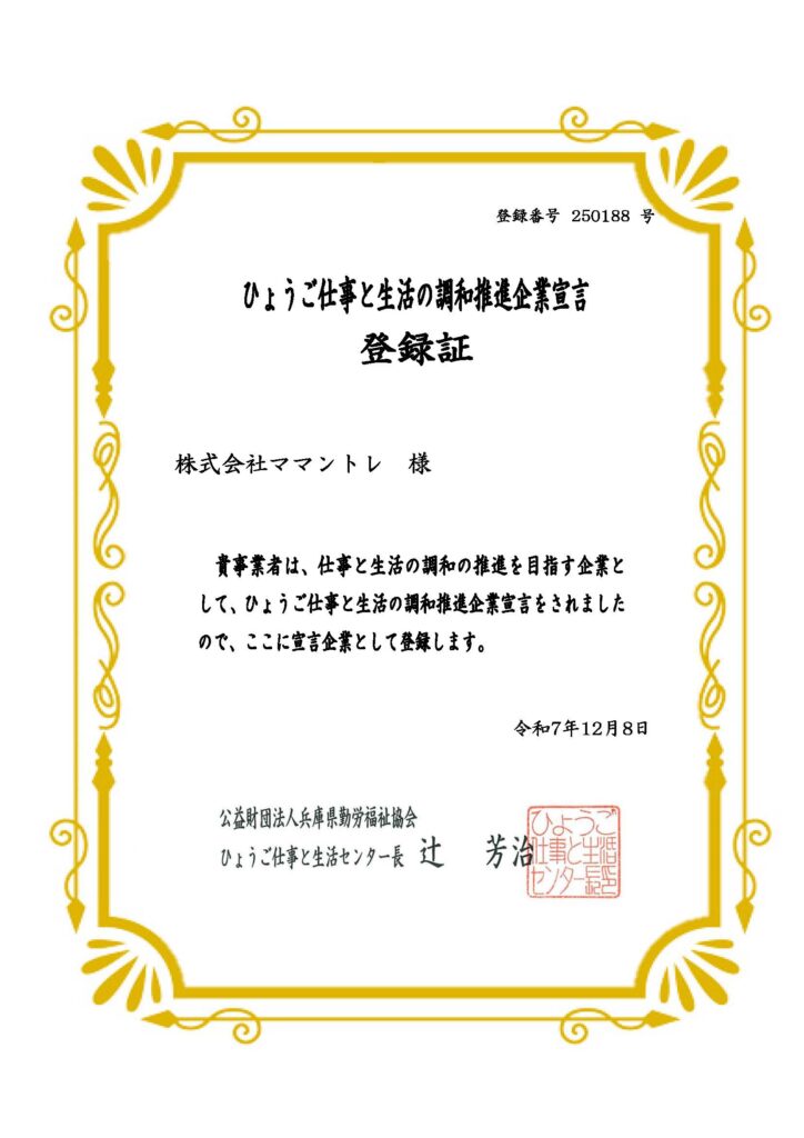 この度、株式会社ママントレは「ひょうご仕事と生活の調和推進企業宣言書」を提出し、「宣言企業」として登録されました。
